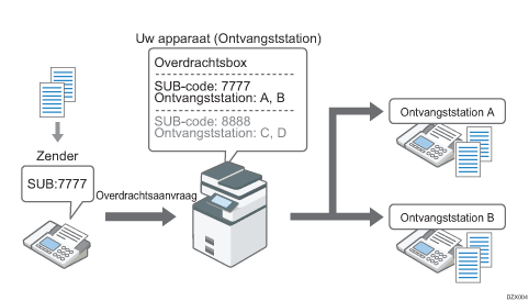 Wanneer de SUB-code die is opgegeven door de afzender en de SUB-code in de Doorstuurbox van het apparaat overeenkomen, verzendt het apparaat het ontvangen document naar de bestemming die geregistreerd staat in de Doorstuurbox met behulp van broadcastverzending.