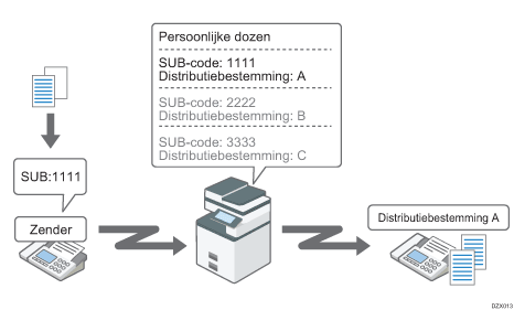 Wanneer de SUB-code die is ingesteld door de afzender en de SUB-code in het persoonlijke postvak van het apparaat overeenkomen, verzendt het apparaat het ontvangen document naar de bestemming die geregistreerd staat in het persoonlijke postvak.