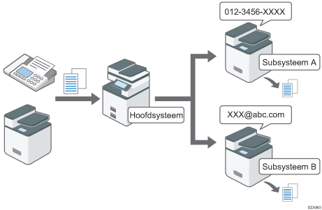 U kunt het subapparaat instellen waarop u een ontvangen fax wilt afdrukken bij de instellingen van het hoofdapparaat.