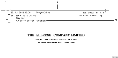 You can register up to ten fax headers (for print) on the machine, and use a separate fax header for each department. When a fax header is not specified when sending, the fax header registered at the top is printed.