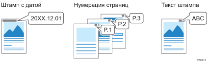 Если совместно с функцией штампа используются функции "Объединить" или "Брошюра", результаты зависят от выбранной функции штампа.
