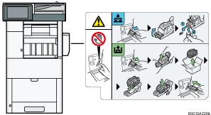 Póngase en contacto con su proveedor de consumibles y prepare grapas nuevas para reabastecer la máquina cuando se muestre el mensaje “Grapas casi agotadas.”. Sustituya las grapas después de que se muestre el mensaje en el que se solicita la sustitución en el panel de mandos.