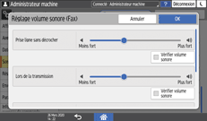 Pour régler le volume du signal sonore associé à ces opérations (Prise ligne ss décr., Lors de la transmission, À la réception, À la numérotation), appuyez sur [Réglage volume sonore (Fax)] puis déplacez le curseur. Vous pouvez vérifier le volume en cochant la case [Vérifier volume sonore].