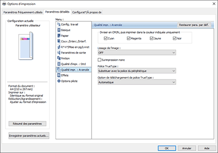 Configurez le paramètre dans le menu [Qualité impr. : Avancée] sur l'onglet [Paramètres détaillés].
