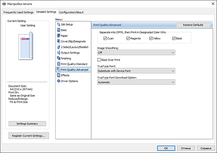 В блоке [Print Quality] на вкладке "Наборы свойств" выберите "Separate into CMYK", а затем выберите цвета для использования.