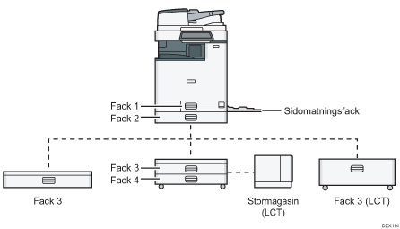 Stormagasinet rymmer endast stående A4-papper. Kontakta en servicerepresentant för att ställa in papper med formatet B5 eller 81/2 × 11.