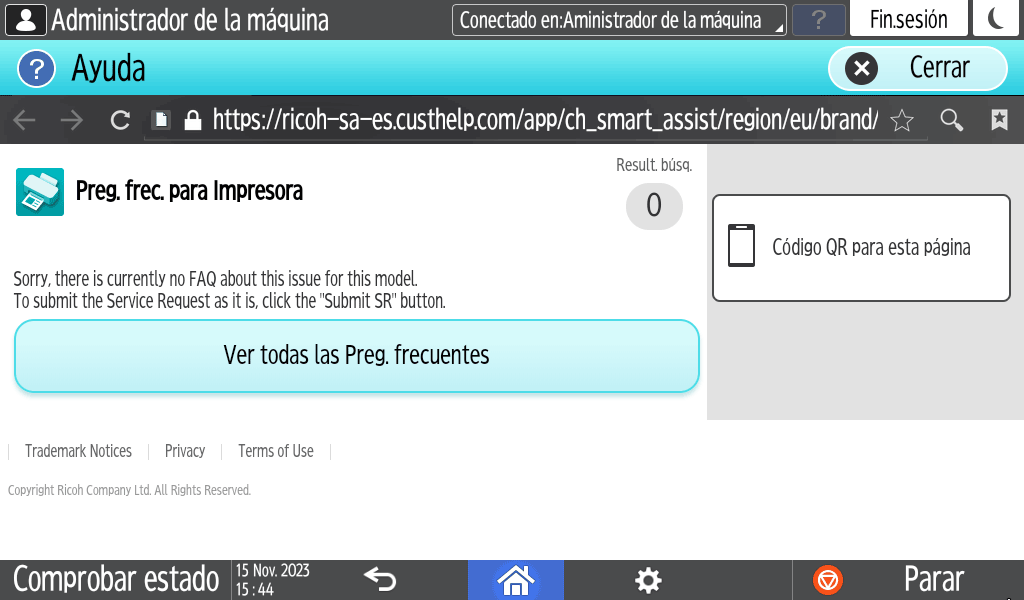Cuando desee visualizar la pantalla [Ayuda] en su dispositivo inteligente, lea el código QR que aparece en la pantalla con su dispositivo inteligente.Cuando la máquina esté conectada a Internet