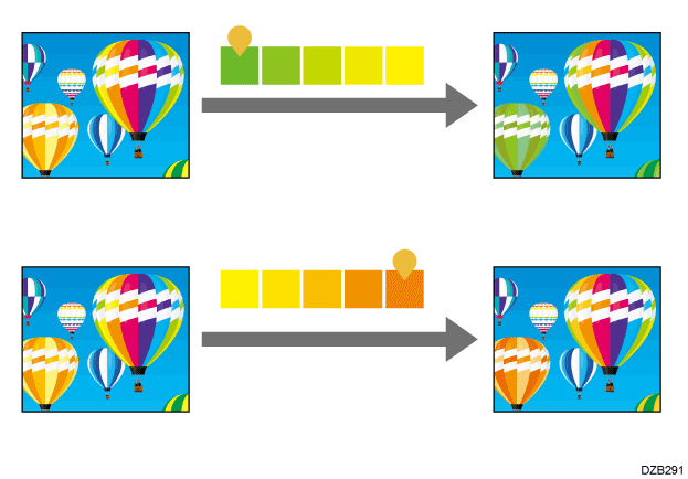 Por ejemplo, la parte azul del original puede sustituirse con naranja al copiar. Se pueden sustituir hasta cuatro colores al mismo tiempo.