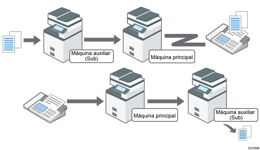 Mediante el uso de la función de fax de la máquina principal, puede enviar y recibir faxes desde un dispositivo (máquina secundaria) que no tenga función de fax. Utilice la pantalla de Fax remoto de la máquina secundaria para enviar un fax desde la máquina principal, o imprima el fax recibido en la máquina principal desde la máquina secundaria. Esta función solo se puede utilizar entre nuestras MFP.