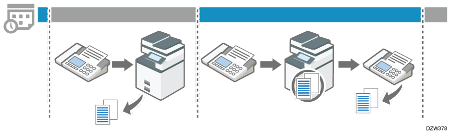 Puede cambiar el comportamiento de salida de la máquina cuando se reciben documentos en función de la hora o el día de la semana, o del tipo de documento recibido (Temporizador cambio modo salida).