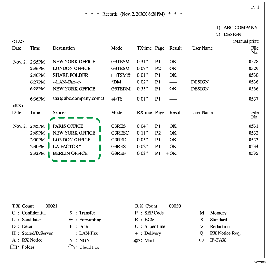 Coincidencia total: la máquina imprime los faxes recibidos en el papel cargado en la bandeja bypass cuando la información recibida del remitente coincide totalmente con la información registrada.