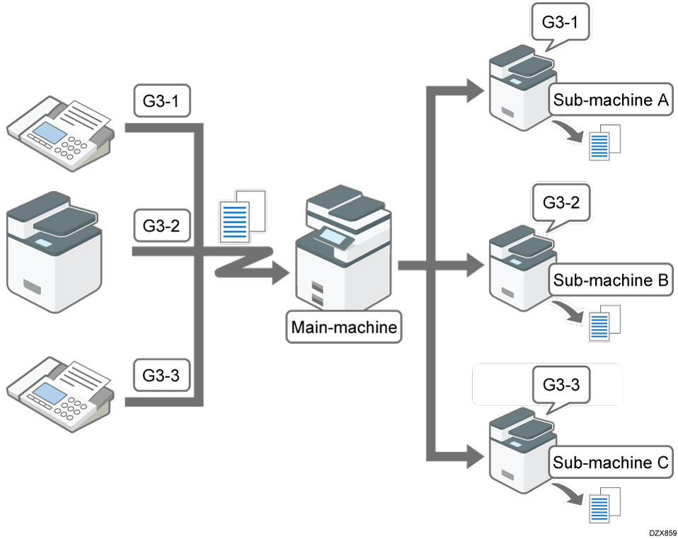Register the sub-machine to forward received faxes in [Fax Settings]