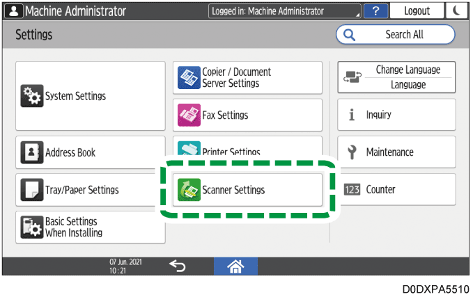 When administrators with custom privileges are registered, an administrator with privileges to change the scanner settings can also log in to the machine and change settings.Press [Settings] on the Home screen.
