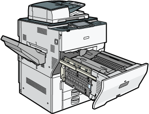 Stellen Sie beim Öffnen des Fachs sicher, dass Sie es komplett in Ihre Richtung herausziehen. Wenn die Abdeckung der Fixiereinheit im Hauptgerät festhängt, halten Sie den Hebel in der Mitte des Faches fest und ziehen das Fach mit Kraft heraus, damit die gesamte Fixiereinheit aus der vorderen Abdeckung heraussteht.
