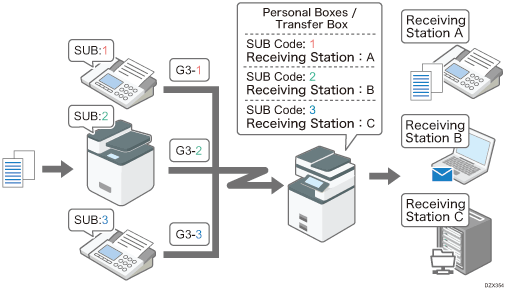 When the SUB Code specified by the sender and the SUB Code in the Personal Box of the machine match, the machine distributes the received document to the destination registered in the Personal Box.