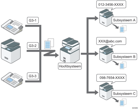 U kunt het subapparaat instellen waarop u een ontvangen fax wilt afdrukken bij de instellingen van het hoofdapparaat.