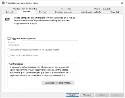 Para compartir la impresora con un usuario que use otra versión de Windows, haga clic en [Controladores adicionales].