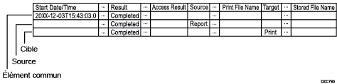 Imprime le « Résultat », le « Statut » et les informations d’entrée du journal de travaux des éléments communs. Lorsqu’il y a plusieurs sources, plusieurs lignes sont imprimées.