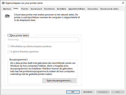 Vink het selectievakje [Deze printer delen] aan op het tabblad [Gedeeld].