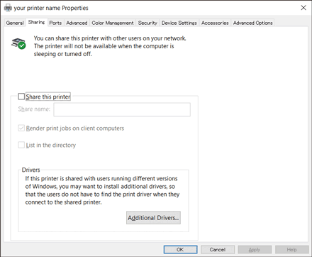 To share the printer with the user who uses Windows of the other version, click [Additional Drivers].