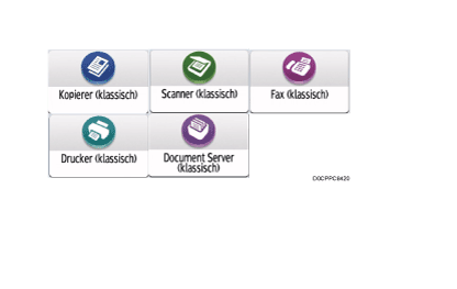 Auf diesem Gerät werden Standardfunktionen als klassische Anwendungen bereitgestellt. Die klassischen Anwendungen werden mit "(Klassisch)", das an ihre Namen angehängt wird, angezeigt. Zum Beispiel: "Kopierer (Klassisch)".