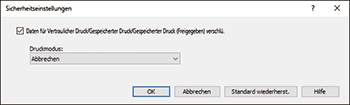 Klicken Sie [Sicherheitseinstellungen...], und markieren Sie das Kontrollkästchen [Daten für Vertraulicher Druck/Gespeicherter Druck/Gespeicherter Druck (Freigegeben) verschlü.].
