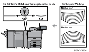 Korrekturstufe Papierwellung | Legen Sie zur Beseitigung der Papierwellung eine Stufe fest: [Stufe 1 (Leicht)], [[Stufe 2], [Stufe 3], [Stufe 4] und [Stufe 5 (Stark)]. Bei Verwendung der Glättvorrichtung zur Korrektur der Papierwellung müssen Sie darauf achten, eine Wellung nach oben zu vermeiden. Wenn die Glättung eine Wellung nach oben verursacht, sind Papierstaus bei Finishing-Prozessen wahrscheinlich, wenn die Falzfunktion ausgewählt wird.