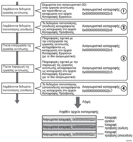 Όταν το μηχάνημα λαμβάνει μια εργασία εκτύπωσης, δημιουργεί ένα αναγνωριστικό καταγραφής για την εργασία και καταχωρίζει πληροφορίες για τη λήψη των δεδομένων στην καταγραφή εργασιών.(1)