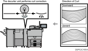 Paper Curl Correction Level | Specify a level from [Level 1 (Weak)], [[Level 2], [Level 3], [Level 4], and [Level 5 (Strong)] to correct the paper curl. When using the decurler to correct paper curl, take care to avoid upward curling. If decurling results in upward curling, paper jams are likely when finishing processes that involve the fold function are selected.