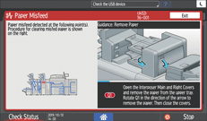 Paper is not delivered to the output tray when stapling the output paper. | The paper not yet stapled remains inside the machine when copying is canceled while Staple printing is in progress. | Press [Reset] and remove the paper remaining inside the staple unit. |