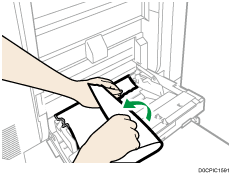 If the trailing edge of the banner sheet is on the bypass tray, a procedure to open the upper right cover is displayed on the screen. Before opening the upper right cover, cut the trailing edge of the banner sheet by following the procedures described below.
