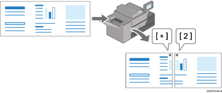 La máquina reduce e imprime una página que se divide e imprime normalmente en dos hojas de papel en una sola página (Reducción de páginas).