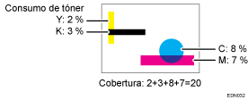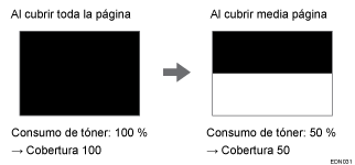 Visualizar/Imprimir contador | Puede ver e imprimir el contador de cada función. El contador de cobertura que se muestra como elemento en la información del contador muestra la cantidad de tóner realmente usada como proporción del área impresa, asumiendo que la cantidad usada al llenar la página entera es del 100%. ![]() Al imprimir una página en color, el valor del contador indica la suma del ratio de cobertura de cada color. ![]() |