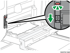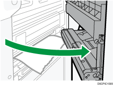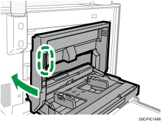 Si el borde final de la hoja banner está en la bandeja bypass, se mostrará en la pantalla un procedimiento para abrir la tapa superior derecha. Antes de abrir la tapa superior derecha, corte el borde final de la hoja banner según los procedimientos que se describen a continuación.