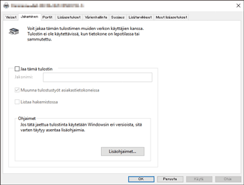 Voit jakaa tulostimen toista Windows-versiota käyttävän käyttäjän kanssa napsauttamalla [Lisäohjaimet].
