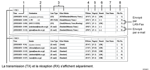 « --LAN-Fax --> » indique le résultat d'une transmission depuis un ordinateur vers l'appareil. Pour le résultat de transmission vers le destinataire, consultez l'information de la colonne « Résultat » pour le même numéro de document.