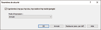 Cliquez sur [Paramètres de sécurité...], et sélectionnez la case à cocher [Crypt données à impr pour Impr sécur, Impr stockée et Impr stockée (partagée)].