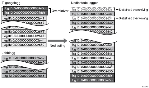 Hvis antall logger som kan lagres på maskinen overskrider grensen og nye logger genereres, slettes de eldste loggene og overskrives av nyere logger. Hvis loggene ikke lastes ned jevnlig, kan det hende det ikke er mulig å lagre de gamle loggene til filer.