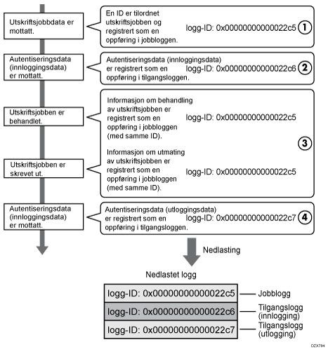 Utskriftsloggposter blir registrert før loggposten registreres i tilgangsloggen.