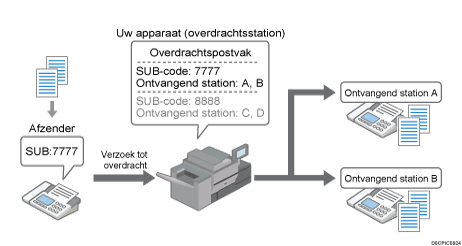 Wanneer de SUB-code die is opgegeven door de afzender en de SUB-code in de Doorstuurbox van het apparaat overeenkomen, verzendt het apparaat het ontvangen document naar de bestemming die geregistreerd staat in de Doorstuurbox met behulp van broadcastverzending.