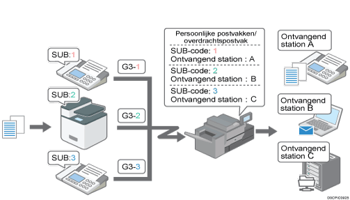 Wanneer de SUB-code die is ingesteld door de afzender en de SUB-code in het persoonlijke postvak van het apparaat overeenkomen, verzendt het apparaat het ontvangen document naar de bestemming die geregistreerd staat in het persoonlijke postvak.