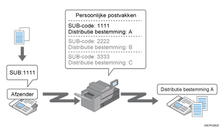 Voordat u faxen ontvangt in een persoonlijk postvak, moet u de afzender informeren over de SUB-code die geregistreerd staat voor het persoonlijke postvak. De ontvangen fax wordt toegewezen aan het persoonlijke postvak met de overeenkomende SUB-code.