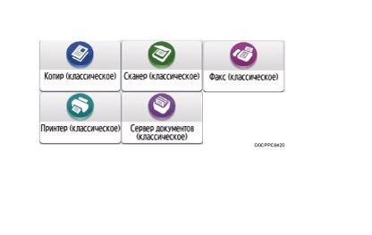 В этом аппарате стандартные функции предоставляются в виде классических приложений. Классические приложения отображаются с надписью "(Классическое)", добавленной к их названию, например "Копир (классическое)".