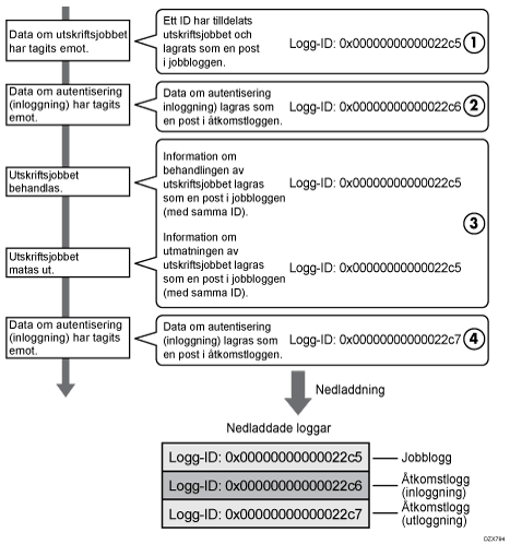 När maskinen tar emot ett utskriftsjobb skapar den ett logg-ID för jobbet och registrerar information om datamottagningen i jobbloggen.(1)